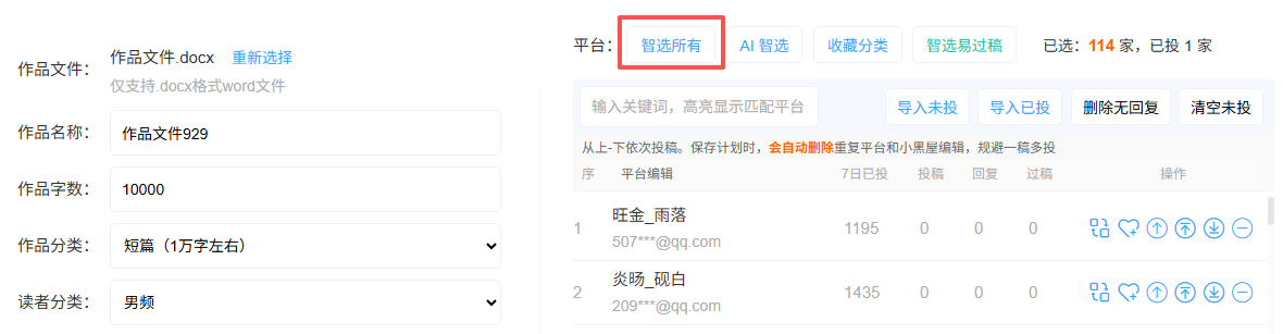 在投稿计划里面填好基础信息后,直接点击【智选所有】,系统会根据作品字数、分类、风格和类型匹配收对应作品的编辑,再保存投稿计划开始投稿就可以。如果给智选所有的平台投完后,等5天都没有过稿,可以考虑投下一轮。